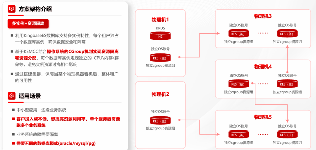 基于数据库实例的多租户方案:利用金仓数据库支持多实例特性,每个租户独占一个数据库实例,确保数据安全和隔离。基于KEMCC结合cgroup资源隔离技术,为每个数据库实例规定独立的CPU、内存、存储等资源,避免实例资源过高相互影响。