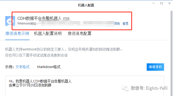 企业微信群中的管理员可以根据需求创建不同功能的“群机器人”,包括监控告警,数据推送,自动回复等。这里我们采用群机器人的功能实现Cloudera Manager的监控告警。