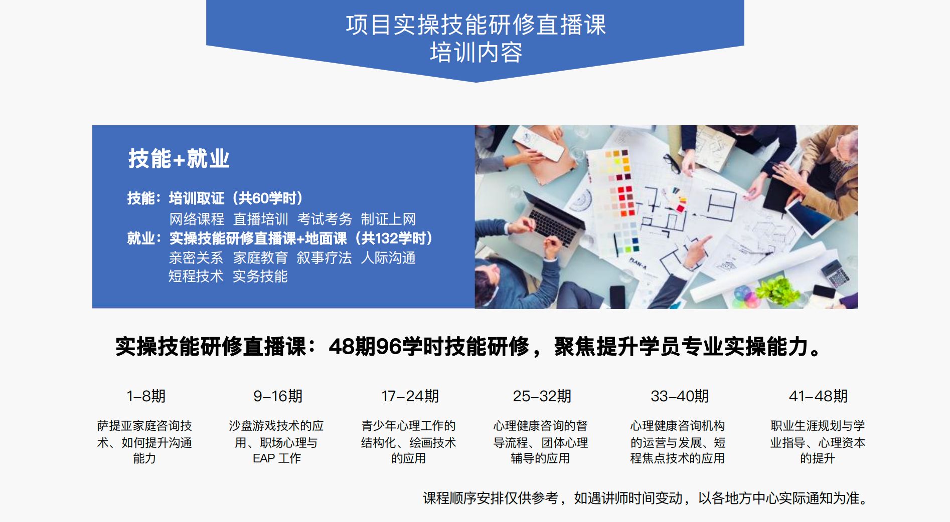 - 高阶研修阶段:开放48期直播特训(96学时)及10大专题地面实操课(36学时),涵盖沙盘技术、短程焦点治疗、家庭系统咨询等紧缺技能,由行业实战专家手把手教学,直击咨询场景中的疑难问题。