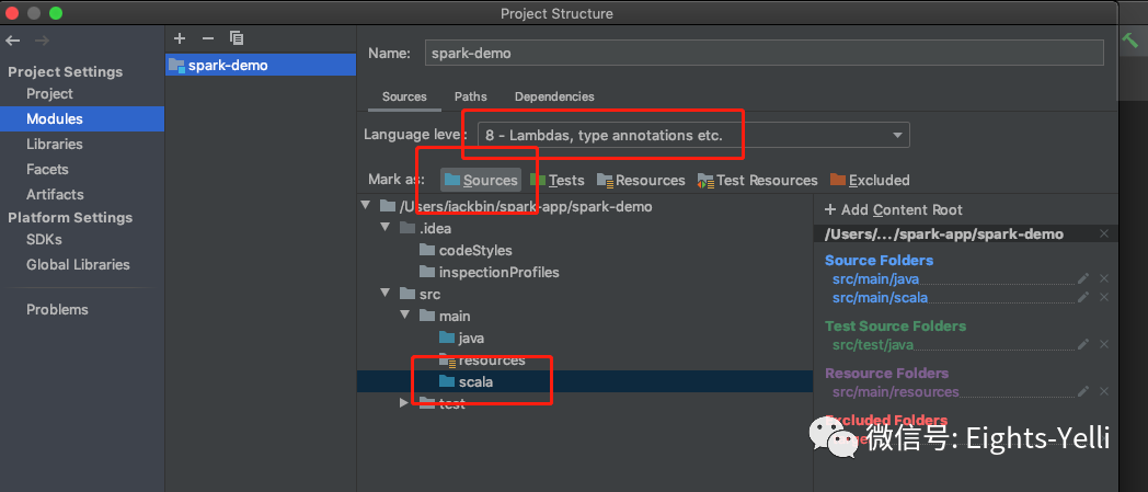 在main包下新建scala目录,在项目模块中将scala调整为source,并选择language level为java8