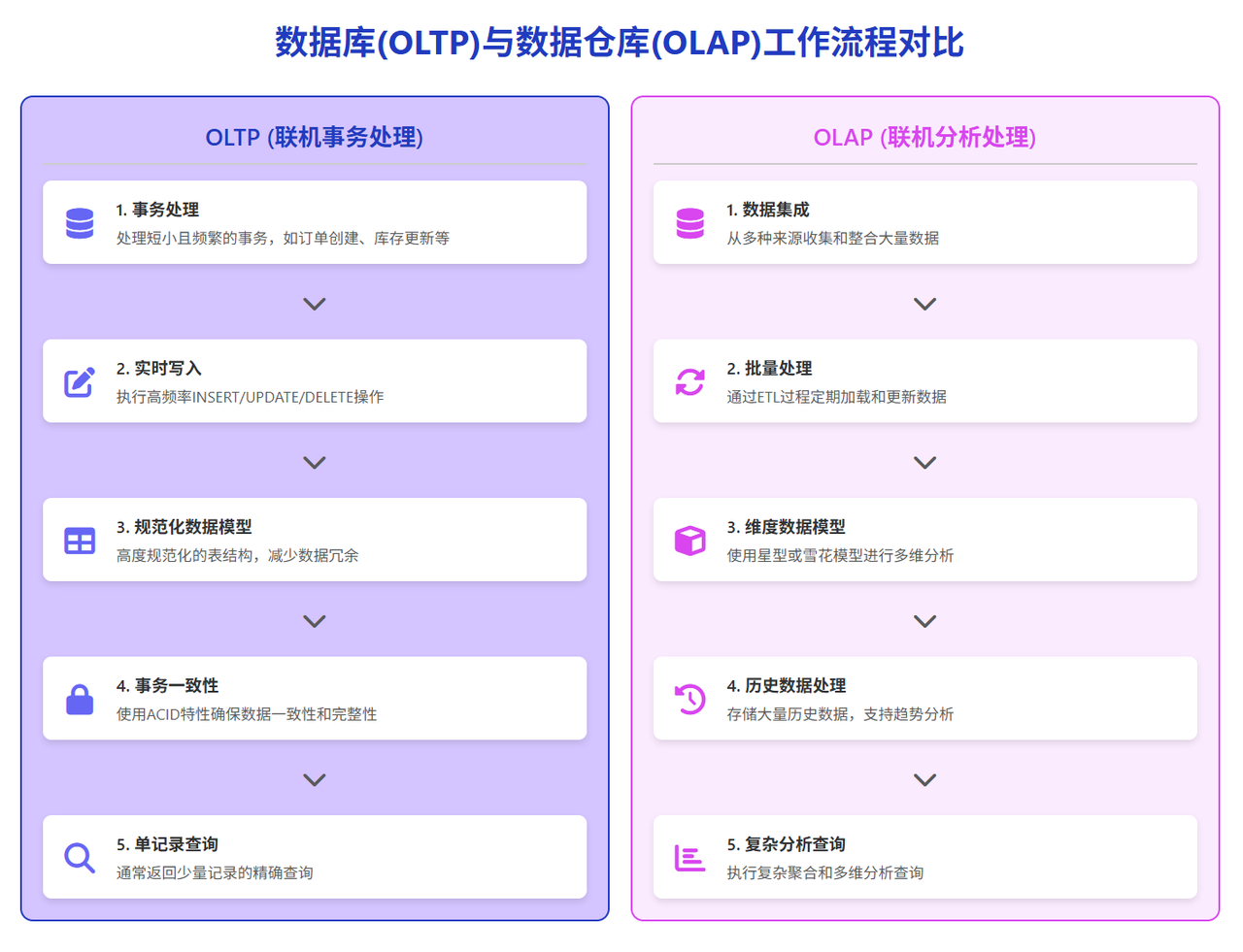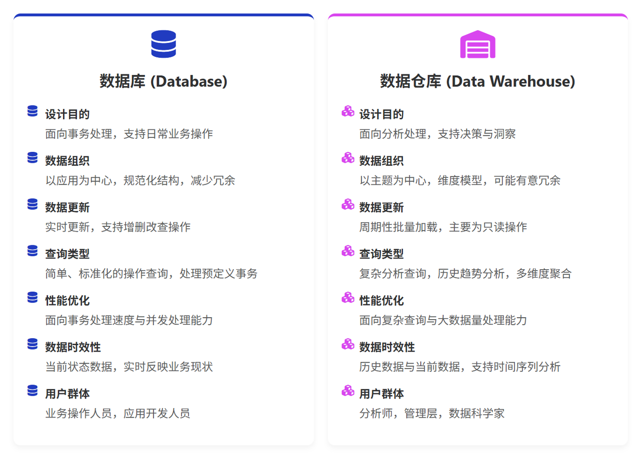 数据库专注于支持企业的日常运营,而数据仓库则致力于提供战略洞察,两者共同构成了企业数据架构的完整生态。