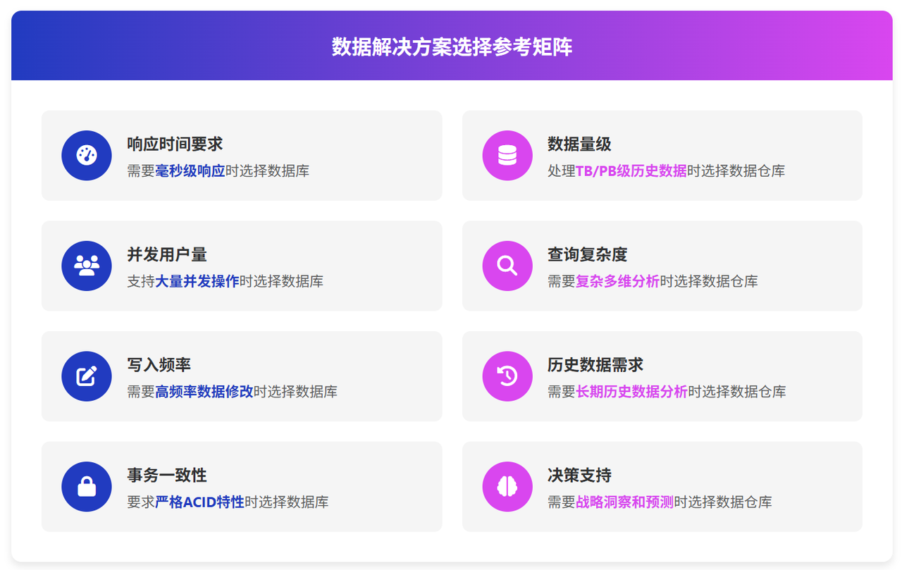 选择数据库还是数据仓库,首先要明确企业的核心需求和优先级。如果企业的首要需求是支持日常业务运营,需要处理大量的实时事务,并且对数据一致性和可用性有严格要求,那么强大的数据库系统将是最佳选择。