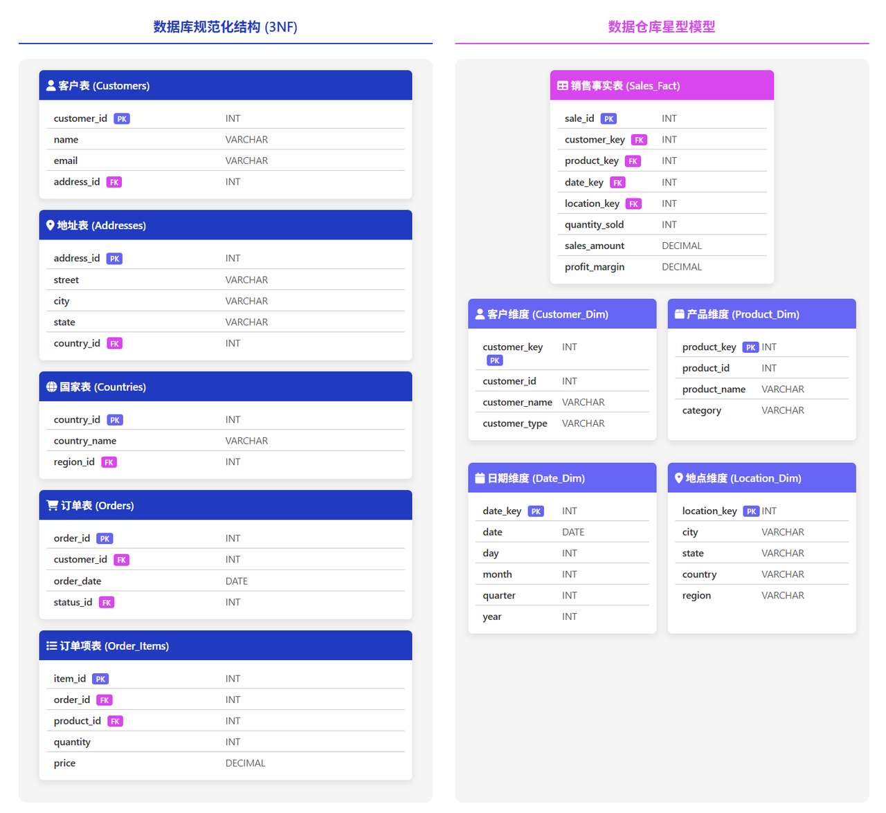 数据仓库则倾向于采用反规范化或星型模型等设计方法。在星型模型中,数据围绕事实表和维度表组织,允许一定程度的数据冗余,以提高分析查询的性能。这种结构使得复杂的多维分析变得更加高效,但不适合频繁的数据更新操作。