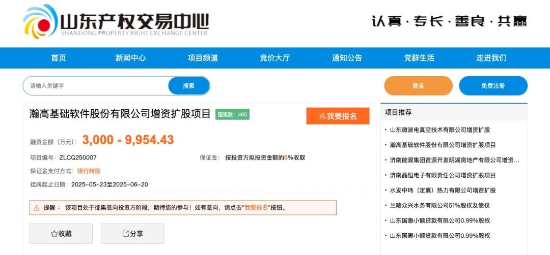 根据5月23日,山东产权交易中心的公告,瀚高软件这轮融资的价格定在每股14.06元,计划募资金额在3000万到9954万元之间,股份占比大概是1.86%到5.93%。投资方征集数量1到8家不等。