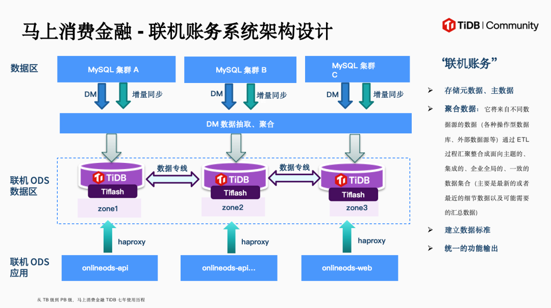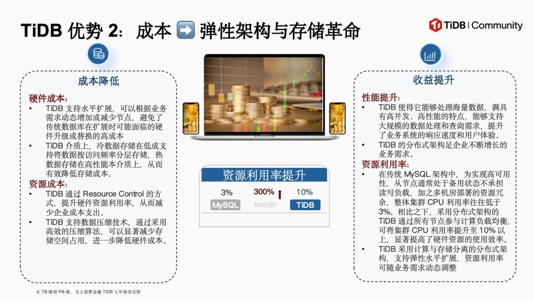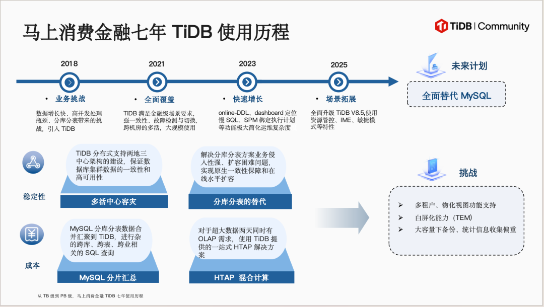 话题概要:马上消费金融作为科技驱动的数字金融机构,2018 年引入 TiDB,七年间数据规模从 TB 级扩展至 PB 级。初期面临数据增长、高并发及分库分表挑战, TiDB 凭借多副本强一致性、智能故障切换和跨机房容灾等特性,满足金融级高可用需求;在线 DDL 支持无锁表变更,全链路监控提升故障定位效率。 成本优化上,TiDB 弹性架构支持水平扩展与数据分层存储,结合资源管控和压缩技术降低成本,集群 CPU 利用率从 MySQL 的低于3%提升至10%以上。 实践中,TiDB 在联机账务系统(处理近 100 T 数据)、统一额度管理平台(25 TB 数据、3万 CPS 并发、延迟 <60ms、可用性 99.99%)等场景表现优异。未来,马上金融消费将逐步扩大 TiDB 使用规模,以分布式架构驱动金融科技效能提升。