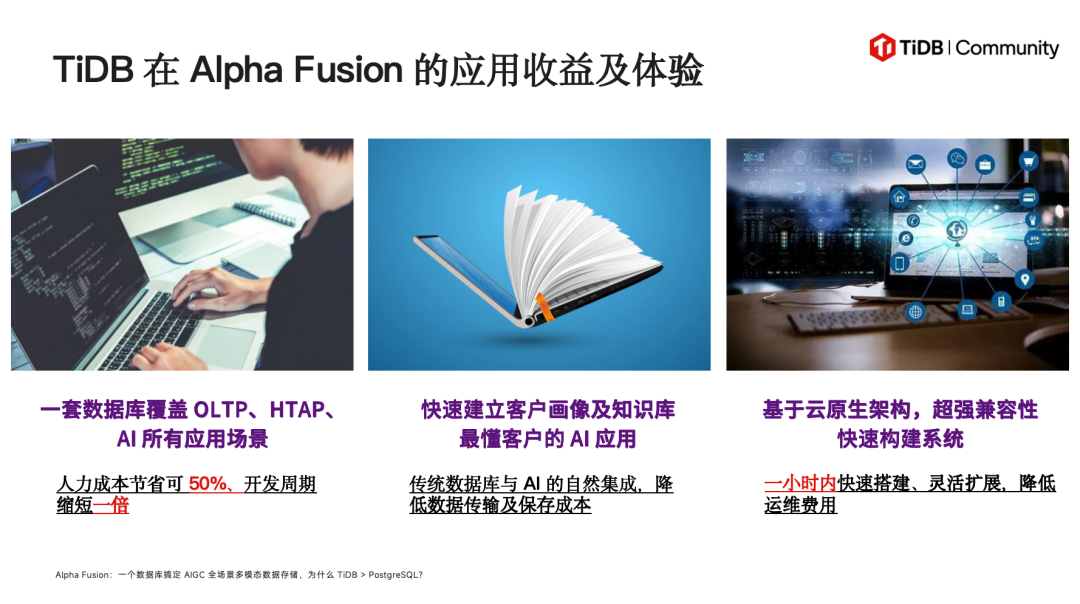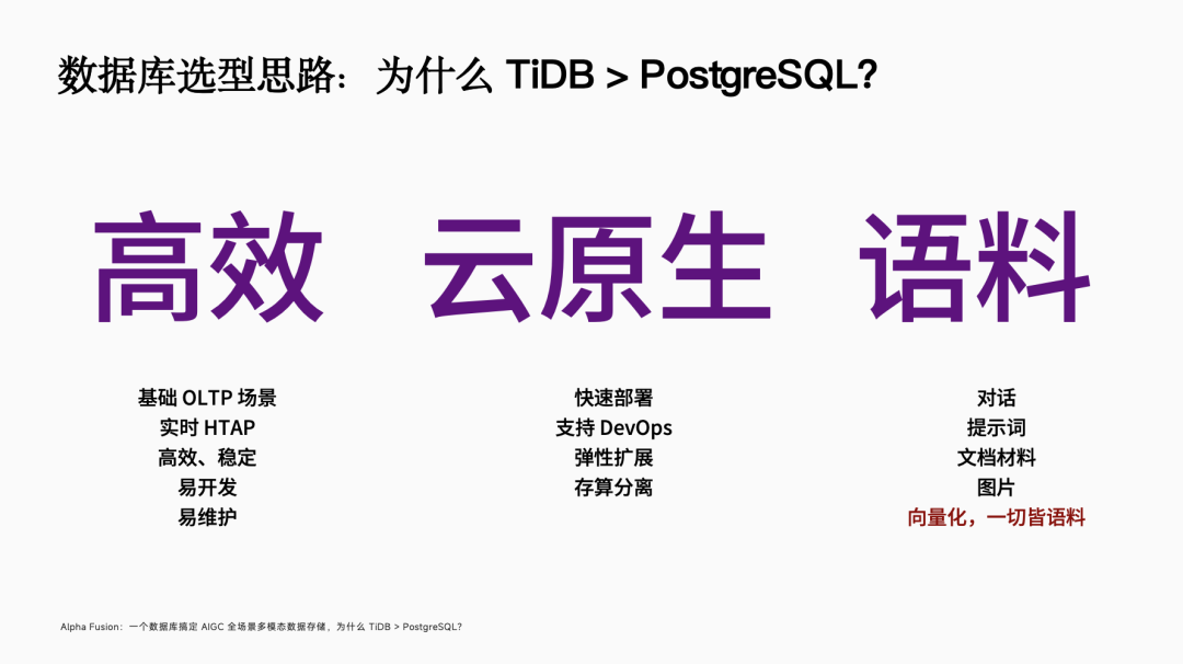 分享话题:Alpha Fusion:一个数据库搞定 AIGC 全场景多模态数据存储,为什么 TiDB > PostgreSQL?
