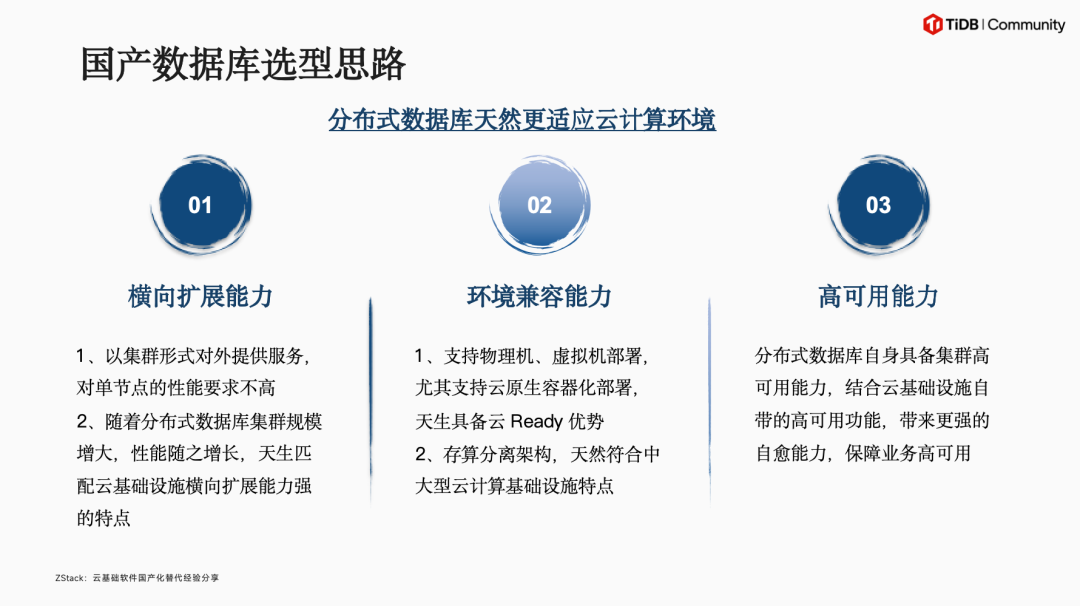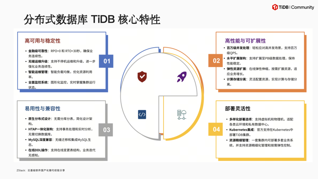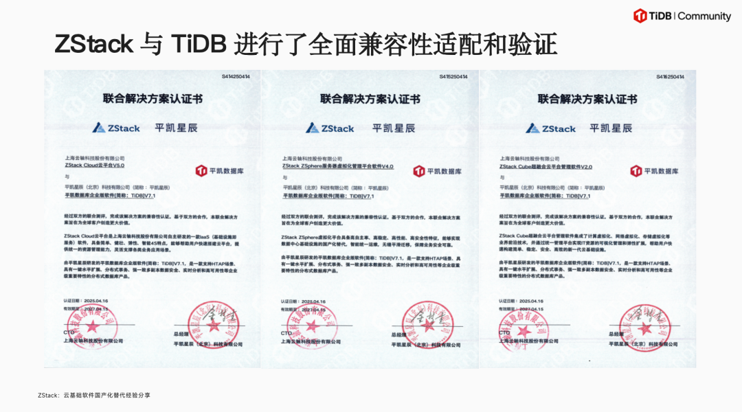 话题概要:作为云基础软件领域具有重要影响力的企业,ZStack 在国产化替代过程中积累了丰富经验。作为分布式数据库,TiDB 因具备适应云环境的特性而备受其关注。 TiDB 以集群模式对外提供服务,对单节点性能要求较低,能随着集群规模扩大而提升性能,契合云基础设施横向扩展的需求。其存算分离特性高度适配中大型云基础设施架构,支持物理机、虚拟化及容器化多元部署模式。此外,TiDB 自身具备集群高可用能力,结合云基础设施的高可用功能,进一步保障了业务的稳定性。目前,ZStack 与 TiDB 已进行全面兼容性适配和验证。基于云原生技术栈的高度协同,ZStack 与 TiDB 将持续深化合作,为全球企业用户提供优质云数据库服务。