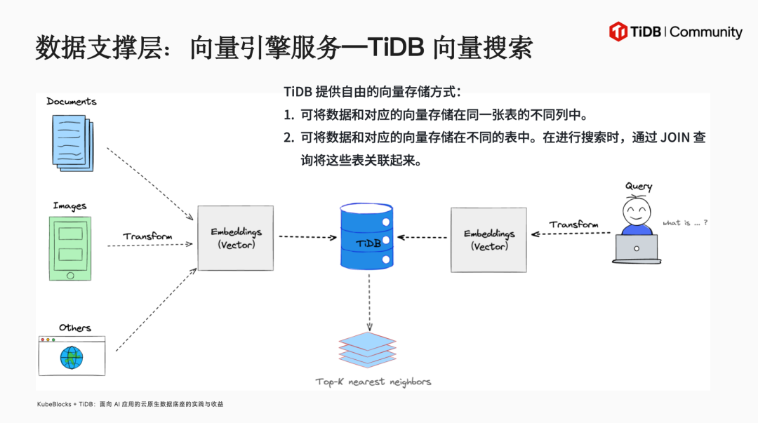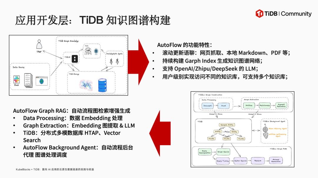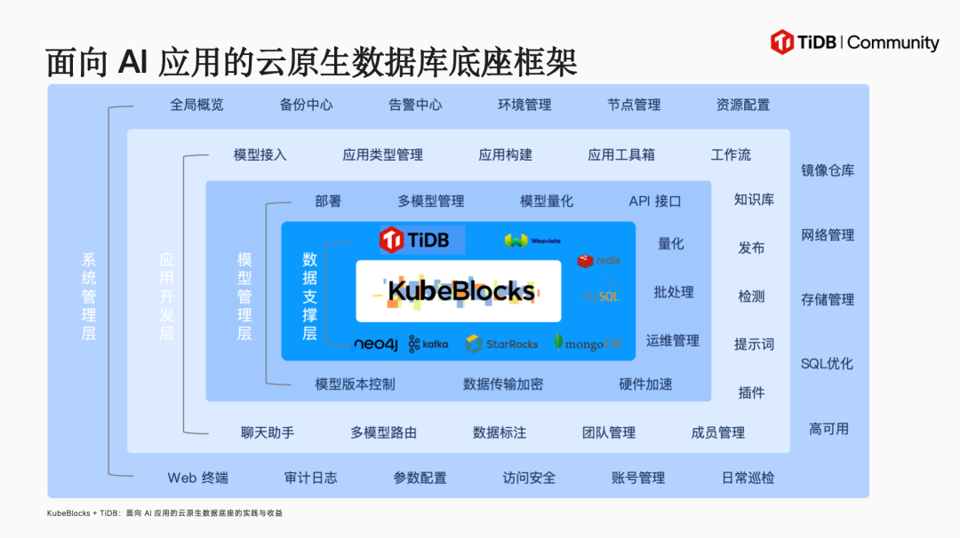 话题概要:AI 应用快速发展的背景下,KubeBlocks 选择与 TiDB 协同构建面向 AI 应用的云原生数据底座,通过标准化 API 、管理系统与资源共池统一资源调度,优化数据库中间件管理,实现降本增效。实际使用中,TiDB 在数据支撑层展现出多方面能力:支持向量存储与检索,原生向量类型适配不同 AI 场景,提供多种距离函数和索引优化;其存算分离架构可无缝水平扩展计算,HTAP 能力支持 OLAP 高可用。“All in TiDB” 实现一套集群处理关系型、向量、文档等多类型数据,综合节省 70% 成本(含运维、硬件、学习成本)。在应用开发层,TiDB 参与集成主流大模型推理框架,通过 TiDB AutoFlow 实现知识图谱构建(Graph RAG)。“云原⽣技术是未来企业 IT 架构和数字化业务的新基⽯、新基因 ”,面向未来 KubeBlocks 将携手 TiDB 进一步提升 AI 基础设施的标准化与运维效率,为企业私有化 LLM 部署提供可扩展的技术支撑。