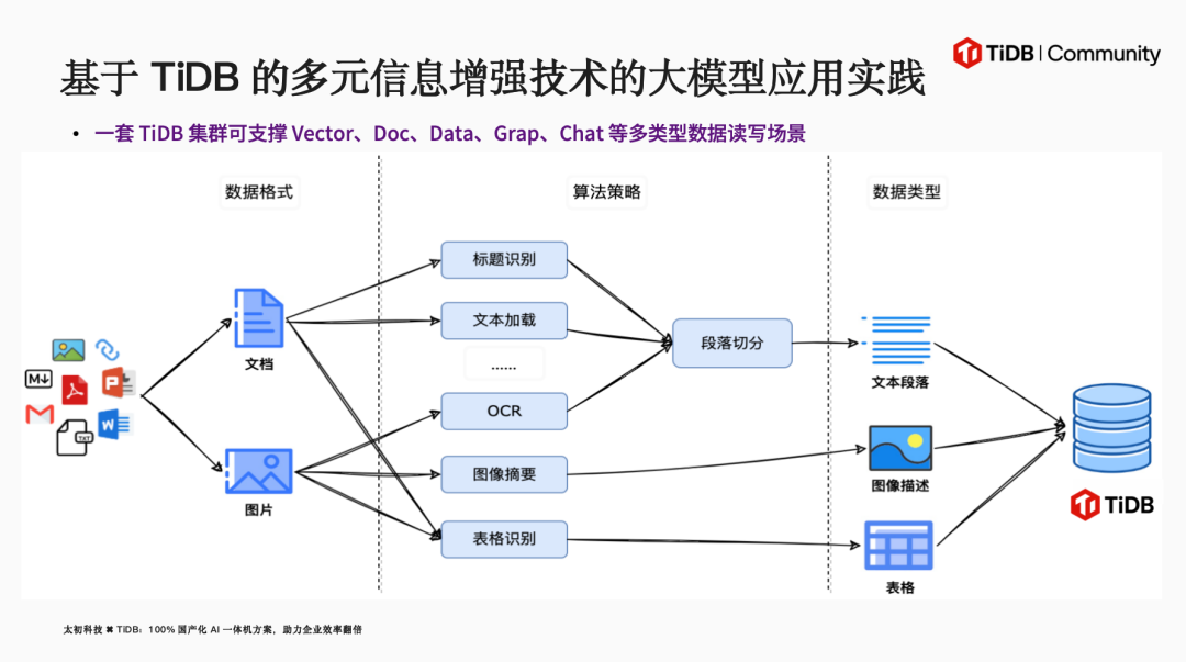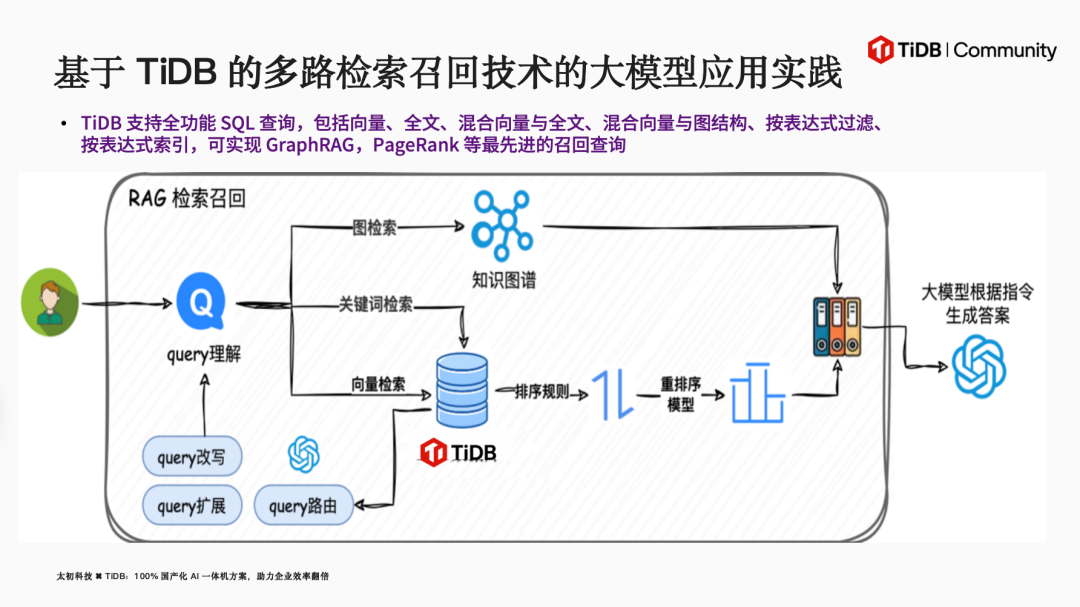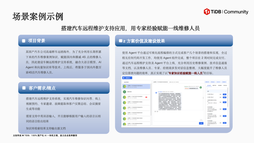 话题概要:太初科技联合 TiDB 推出全栈国产化 AI 一体机方案,聚焦 AI 算力基建与大模型落地。TiDB 作为核心数据底座,凭借分布式架构支持向量、文档、关系型等多模态数据统一存储与检索,其全功能 SQL 查询能力(含向量检索、全文检索及混合召回)可实现先进算法应用,为 DeepSeek 大模型提供高效数据支撑。在优化数据处理效率方面,TiDB 存算分离架构可实现资源弹性扩展,单集群可承载 TB 级数据并支持水平扩容,满足大模型训练与推理的高并发需求。此外,TiDB 在数据加密、权限管理及多租户隔离方面的能力进一步保障了企业级应用的安全性与稳定性。太初 AI 一体机深度集成 TiDB 能力,在大模型应用实践中,基于 TiDB 的多元信息增强技术、多路检索召回技术,满足汽车远程维护场景需求:快速整合历史维修案例,通过向量数据库实现知识图谱构建与智能问答,将专家经验转化为一线生产力,项目交付周期缩短至两周,显著提升企业智能化转型效率。太初科技✖️ TiDB 双方协同创新,验证了国产化技术栈在复杂业务中的规模化应用潜力。