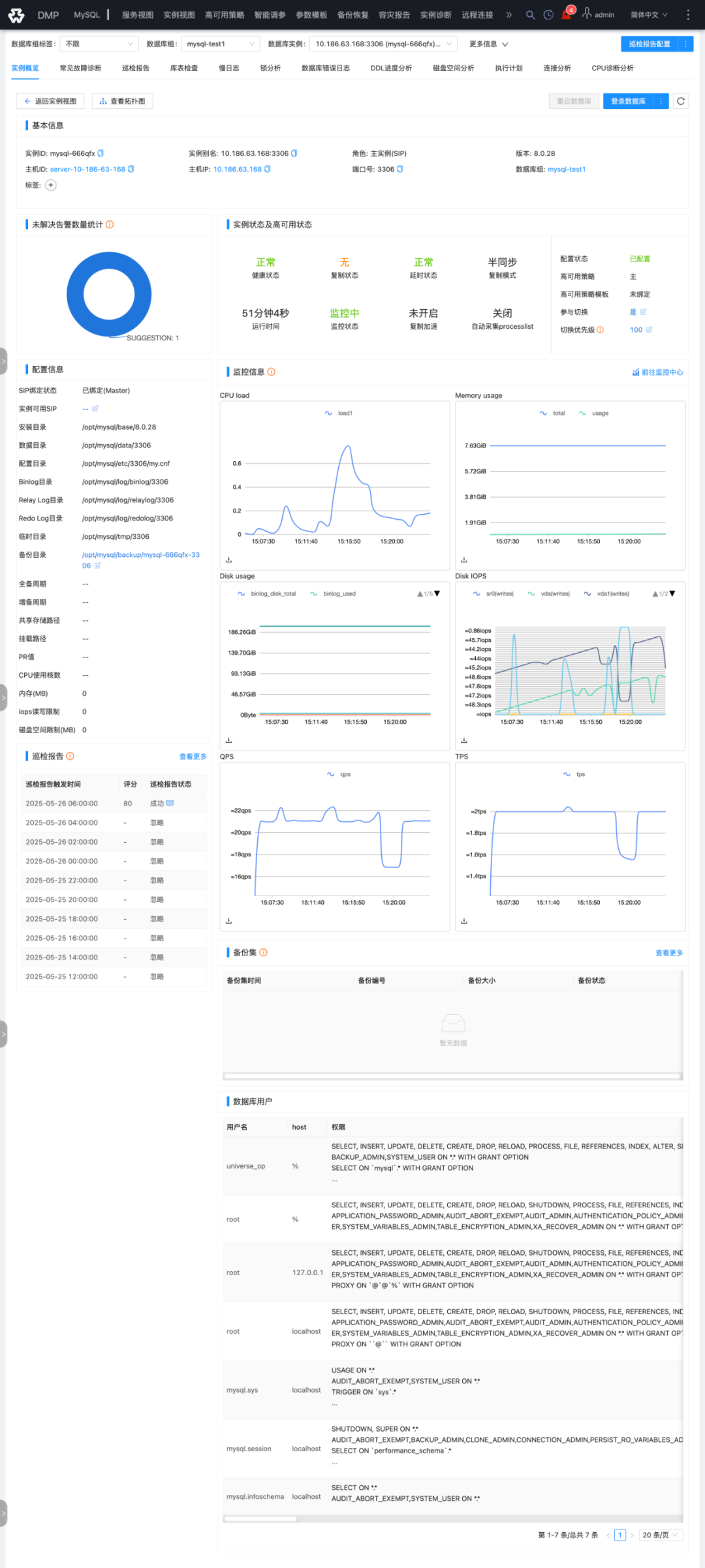 实时掌握数据库核心指标:连接数、QPS、TPS、慢 SQL、锁等待等;