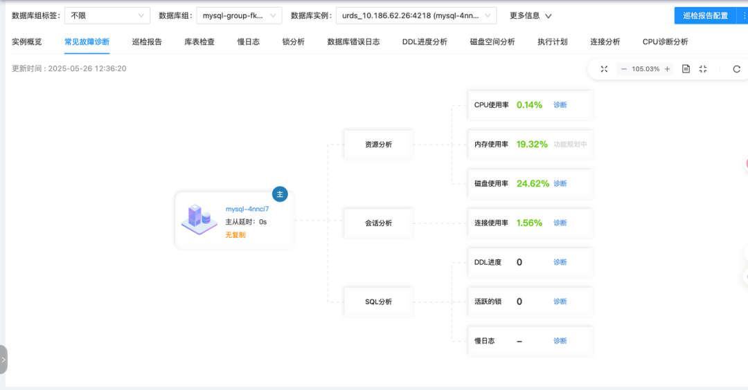 「常见故障诊断」模块,提供 CPU、内存、磁盘、连接、锁、慢 SQL 等关键视角;