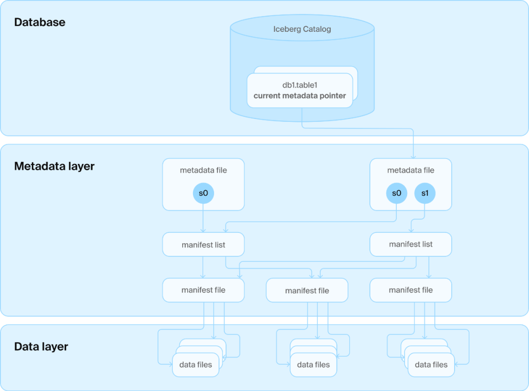 但问题是:Iceberg 和 Delta Lake 的设计初衷是不需要数据库。它们的设计者竭尽全力将高效读取和更新表所需的所有信息编码到 Blob 存储中的文件中。为了实现这一点,他们做出了许多妥协。例如,Iceberg 中的每个根文件都包含所有现有快照、完整的架构信息等。对于每个更改,都会写入一个包含完整历史记录的新文件。许多其他元数据必须批量处理,例如在两层清单文件中,以避免写入或读取过多的小文件,这在 Blob 存储上效率不高。对数据进行细微更改也是一个很大程度上尚未解决的问题,需要复杂的清理程序,而这些程序至今仍未被开源实现所充分理解和支持。许多公司已经存在并仍在努力解决管理快速变化数据的问题。这几乎就像一个专门的数据管理系统是一个好主意。