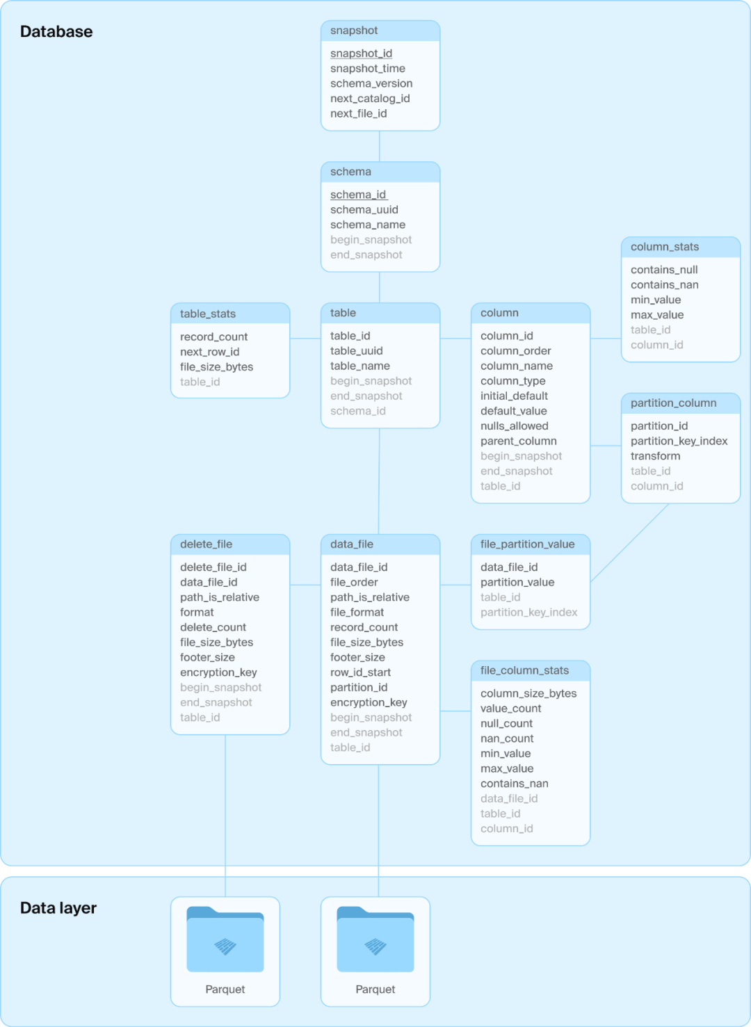 DuckLake 的基本设计是将所有元数据结构(包括目录数据和表数据)迁移到 SQL 数据库中。该格式定义为一组关系表及其上的纯 SQL 事务,这些事务描述了诸如模式创建、修改以及数据的添加、删除和更新等数据操作。DuckLake 格式可以管理任意数量的表并支持跨表事务。它还支持“高级”数据库概念,例如视图、嵌套类型、事务模式更改等;请参阅下文了解列表。此设计的一大优势是通过利用引用一致性(ACID 中的“C”),该模式可以确保不存在重复的快照 ID。