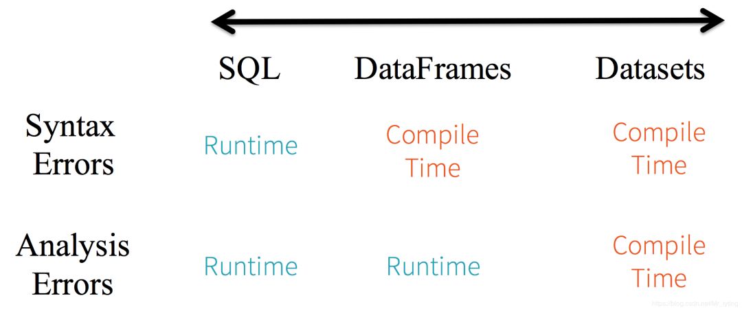 如果你用的是 Spark SQL 的查询语句,要直到运行时你才会发现有语法错误(这样做代价很大),而如果你用的是 DataFrame 和 Dataset,你在编译时就可以捕获syntax errors(这样就节省了开发者的时间和整体代价)。也就是说,当你在 DataFrame 中调用了 API 之外的函数时,编译器就可以发现这个错。不过,如果你使用了一个不存在的字段名字,那就要到运行时才能发现错误了。