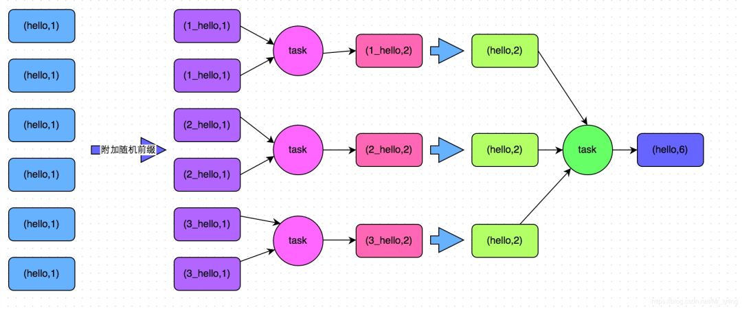 使用map-side预聚合的shuffle操作。所谓的map-side预聚合,说的是在每个节点本地对相同的key进行一次聚合操作,类似于MapReduce中的本地combiner。map-side预聚合之后,每个节点本地就只会有一条相同的key,因为多条相同的key都被聚合起来了。其他节点在拉取所有节点上的相同key时,就会大大减少需要拉取的数据数量,从而也就减少了磁盘IO以及网络传输开销。通常来说,在可能的情况下,建议使用reduceByKey或者aggregateByKey算子来替代掉groupByKey算子。因为reduceByKey和aggregateByKey算子都会使用用户自定义的函数对每个节点本地的相同key进行预聚合。而groupByKey算子是不会进行预聚合的,全量的数据会在集群的各个节点之间分发和传输,性能相对来说比较差。与RDD中groupby效率低下不同,DataFrame中Groupby已经经过本地聚合再全局聚合 加随机数分区分阶段聚合。这个方案的核心实现思路就是进行两阶段聚合。第一次是局部聚合,先给每个key都打上一个随机数,比如10以内的随机数,此时原先一样的key就变成不一样的了,比如(hello, 1) (hello, 1) (hello, 1) (hello, 1),就会变成(1_hello, 1) (1_hello, 1) (2_hello, 1) (2_hello, 1)。接着对打上随机数后的数据,执行reduceByKey等聚合操作,进行局部聚合,那么局部聚合结果,就会变成了(1_hello, 2) (2_hello, 2)。然后将各个key的前缀给去掉,就会变成(hello,2)(hello,2),再次进行全局聚合操作,就可以得到最终结果了,比如(hello, 4)。--- 将原本相同的key通过附加随机前缀的方式,变成多个不同的key,就可以让原本被一个task处理的数据分散到多个task上去做局部聚合,进而解决单个task处理数据量过多的问题。接着去除掉随机前缀,再次进行全局聚合,就可以得到最终的结果。