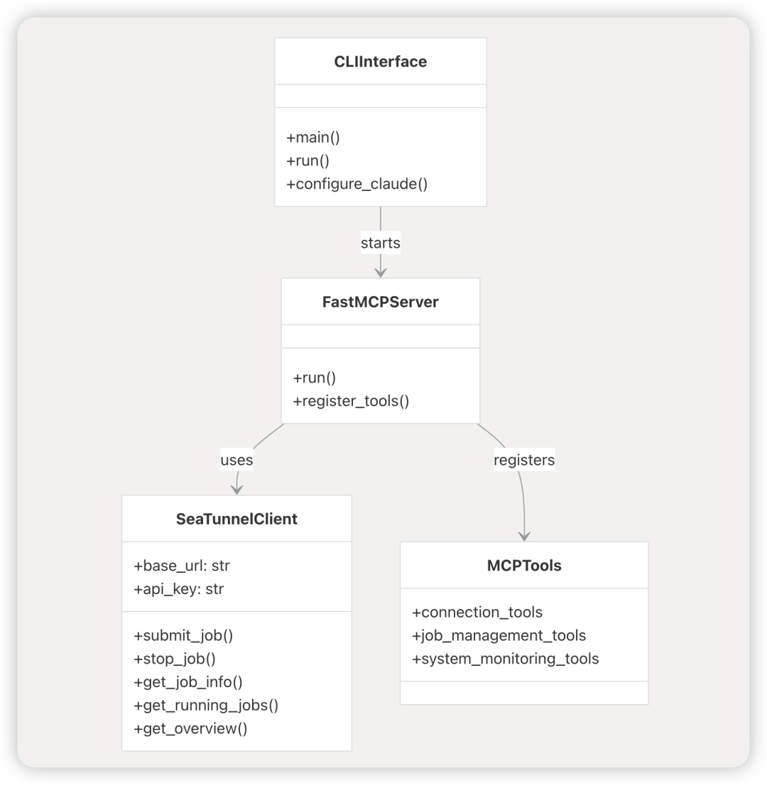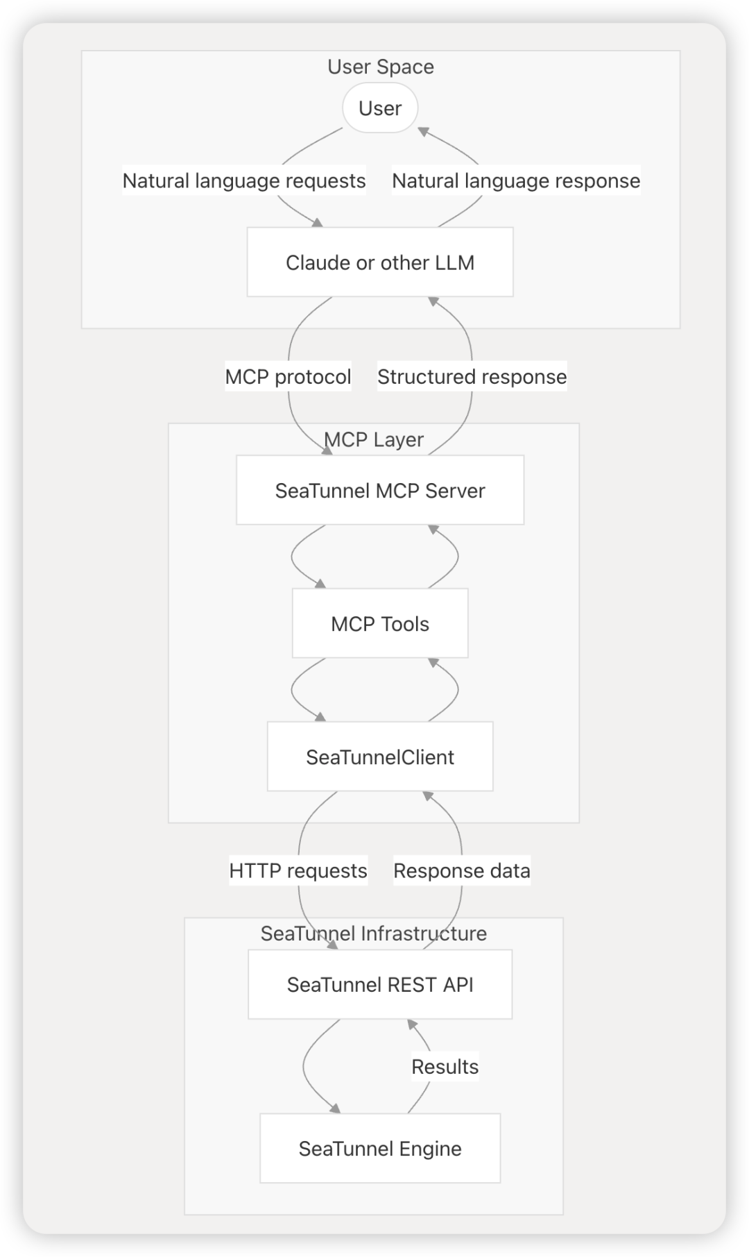 用户通过自然语言与 Claude 等 LLM 进行对话; LLM 将意图转化为 MCP 请求(符合模型上下文协议); MCP 服务器接收请求并翻译为对应的 API 调用; SeaTunnel Client 发起 HTTP 请求,调用 SeaTunnel REST API; SeaTunnel 引擎完成具体操作; 执行结果反向传回,最终由 LLM 生成自然语言反馈给用户。