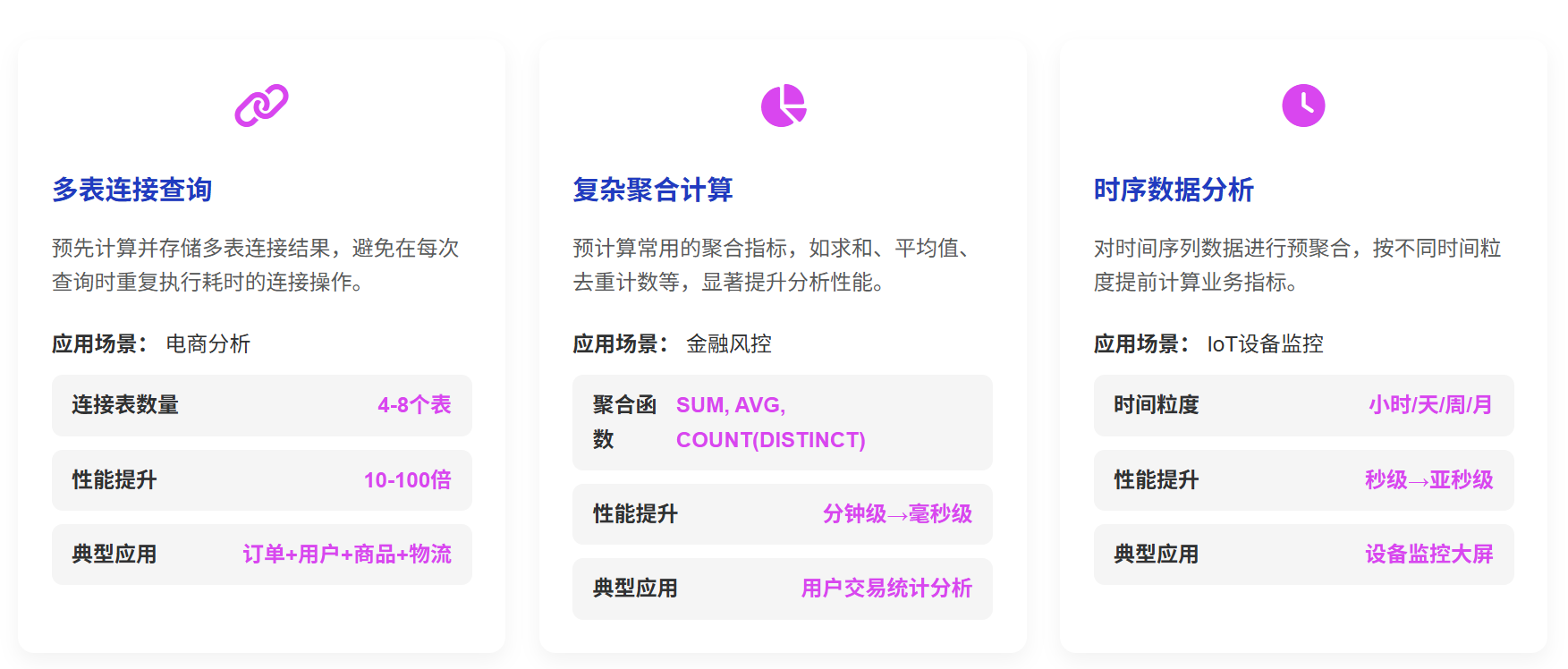 在实时分析场景中,物化视图同样发挥着关键作用: