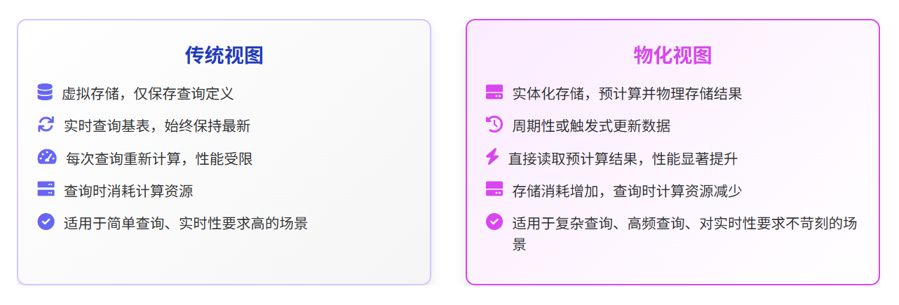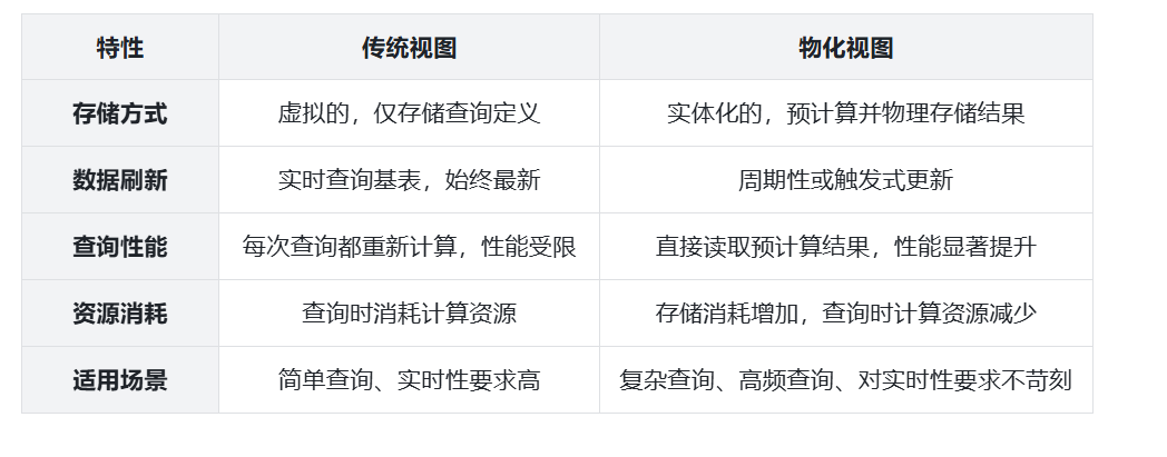 物化视图并不是一个全新的概念,但它与我们熟知的传统视图有着本质区别。下表清晰对比了两者的主要差异: