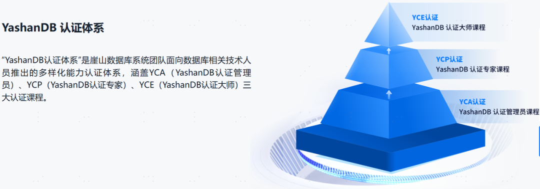 大部分企业在官网上都可以找到培训认证入口,但有些藏的比较深,特别是云厂商往往没有独立的数据库认证口,都是在众多云产品培训之中,需要自己找找。其次是,相关课程设置是否足够明细,包括有的认证是需要有依赖关系,有的是课程与考试相配套的,这点都需要明示出来。学习一门新数据库,起步是比较关键的。这里有几个必备条件,一是数据库介质是否能快速获得,二是环境搭建是否简洁、资源是否足够低,三是相关学习材料是否够多且容易获得。针对第一点,有些厂商产品还提供了留资页面才能获得,有些则可以直接下载。针对第二点,好的一个入手指南很重要,甚至提供了在线环境,直接上手用,这对于小白非常友好。第三点则是要花费精力来开发课件。针对上面几点,各家差异很大,大家体会后自然就知道了。费用的话题是绕不开的,毕竟是会花费厂商一定投入的。目前看到的各家差异比较大,那是不是都免费就好呢?个人觉得也非如此。当前国产数据库还处于相对早期,都在构建自己的生态。认证培训是个很好的着力点。个人建议,在初中级认证,采用免费模式,把入口打开,让广大用户能够进来。针对高级认证收费也合理,毕竟资源投入更大。此外,留有一定的空间给到合作伙伴,毕竟免费不是一种商业模式,只有有钱赚大家才愿意参与,将高级认证或更丰富的培训课程留给伙伴,让大家挣到钱。针对高校学生、社区活跃者,可通过考试券等形式来激励。各家课程设置大体分两类,一类是标准课程(如下图,是我考的崖山数据库认证体系),一类我认为属于非标类的。前者主要针对DBA人群,多采用A-P-M序列的方式来组织,但各家的培训内容差别还是挺大的。个人建议A序列,可讲述概念、入门操作即可;P序列则侧重运维管理层面;M序列则简述优化、排障及原理。后者则是针对其他人群的,包括针对开发者、合作伙伴、分销商或职业教育类,此类培训有其独有特点,课程设置各有特色。5).学习过程是否高效