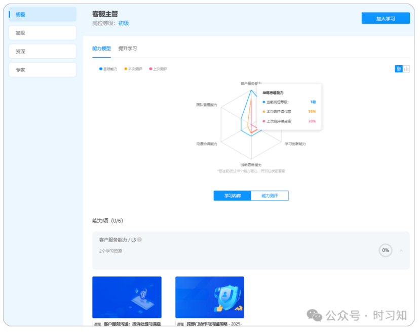 搭建的岗位能力模型上架后,员工可直观对标岗位的能力标准,清晰掌握目标岗位所需的核心能力矩阵及对应学习资源,实现“能力缺口可视化”。企业可针对不同层级的能力项,配备相应课程,生成差异化学习路径。举个例子,产品经理相关课程,初级员工可以侧重基础产品能力夯实,进阶的员工聚焦业务场景深化,资深员工则匹配战略思维与创新实践类课程。