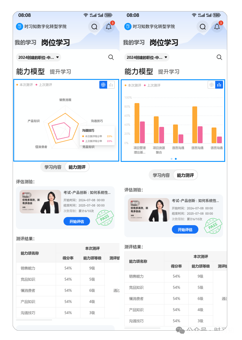 同时,员工也有一份个人评测结果,清晰了解岗位能力要求、自身能力现状以及与平均水平的差距,激发学习目的性和积极性,主动补齐能力短板。
