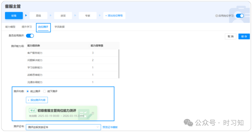 时习知支持定制化能力测评,全方位评估学员能力水平。管理员可以按照岗位能力要求定制测评试卷,并将试卷分发给需要测评的学员。学员可以在 PC 端或移动端完成测评。