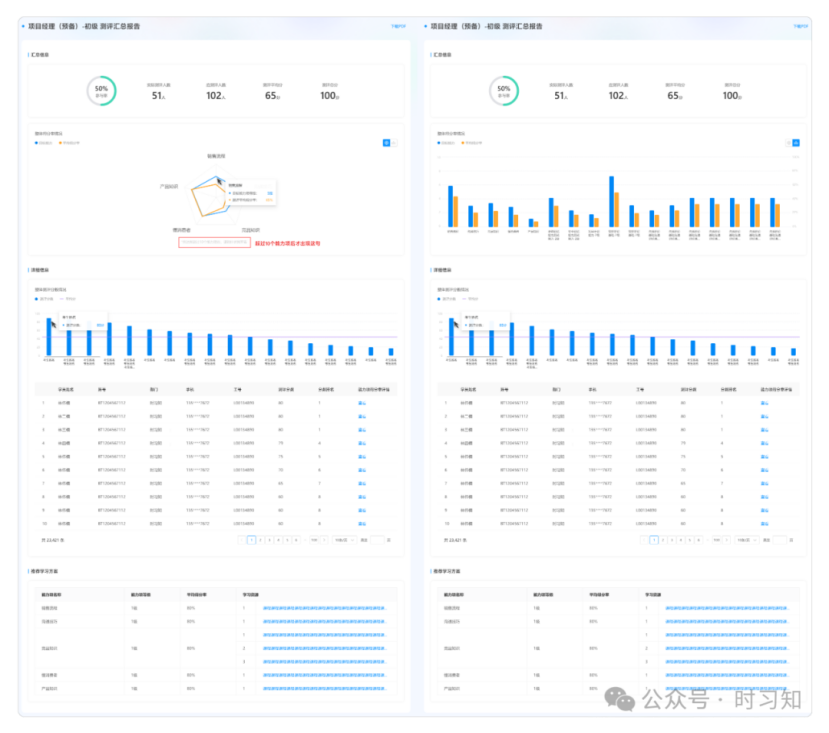 员工完成人才评测后,时习知将生成详细的岗位整体能力评测报告。企业可据此了解整体与个体员工的学习情况,定位待提升的知识和技能,匹配个性化推荐学习方案。
