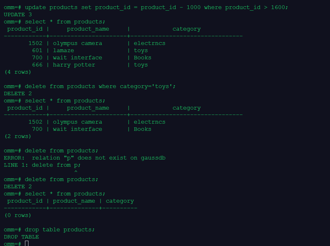 select * from products ;4.将满足product_id > 1600的记录的product_id更新为product_id – 1000,并查看products中所有记录是否更新成功