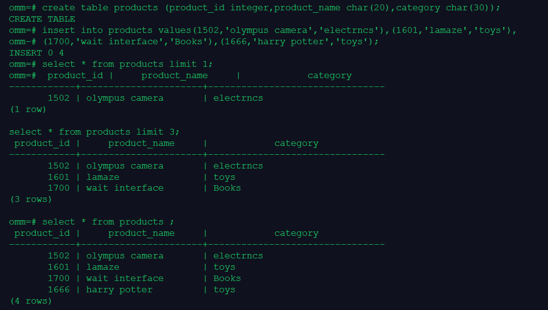 insert into products values(1502,'olympus camera','electrncs'),(1601,'lamaze','toys'),(1700,'wait interface','Books'),(1666,'harry potter','toys');3.获取表中一条记录、三条记录和所有记录