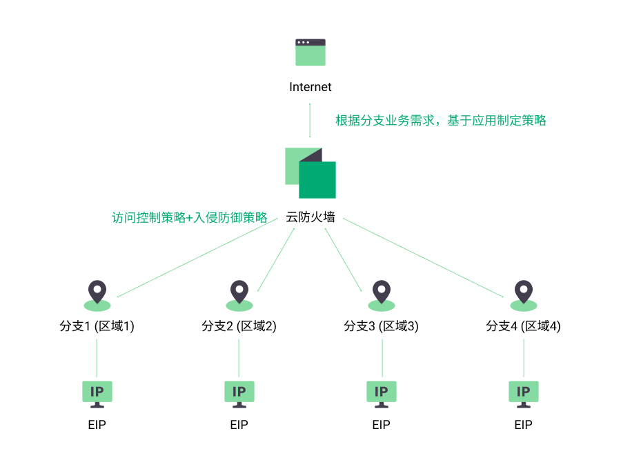 针对拥有不同地区分支机构的企业,云防火墙可以针对不同分支的流量,进行全威胁防御检测与基于用户与应用的访问管控。