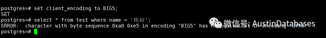 我们来看看下面的操作,将客户端的encoding 变为 BIG5码, 则在键入一些字符,系统会直接报错,无法确认这些字符是什么。