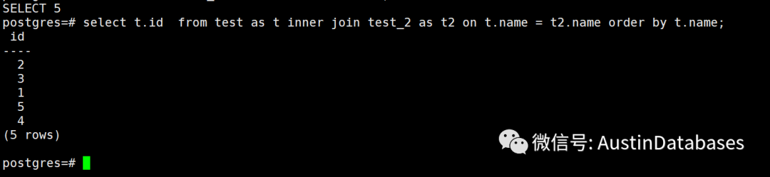 2021-09-02 01:18:51.116 EDT [48166] STATEMENT: select t.id from test as t inner join test_2 as t2 on t.name = t2.name order by t.name;