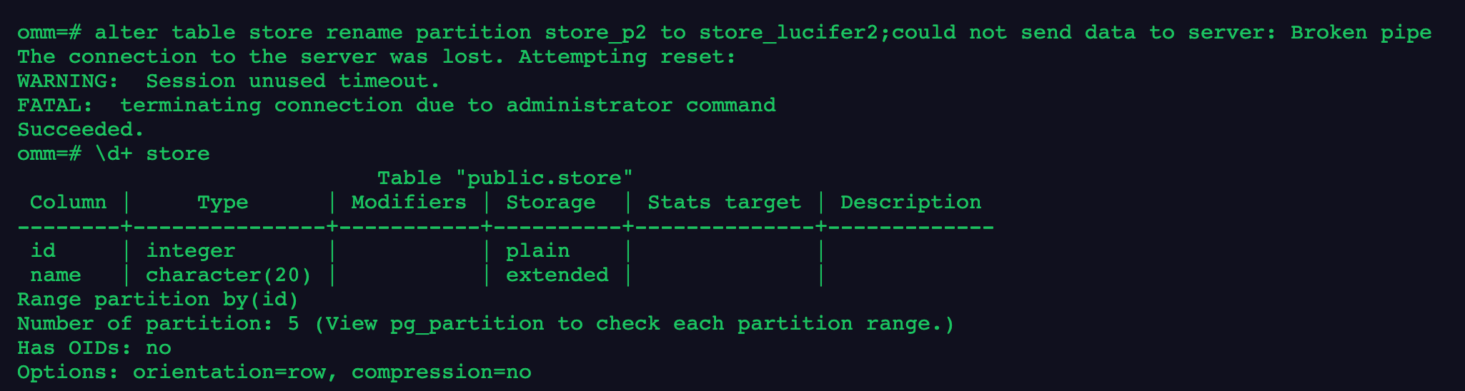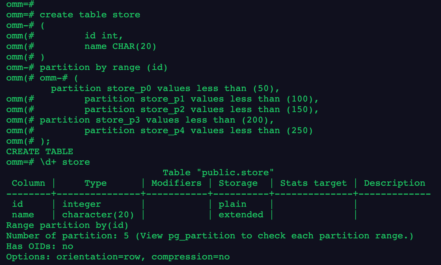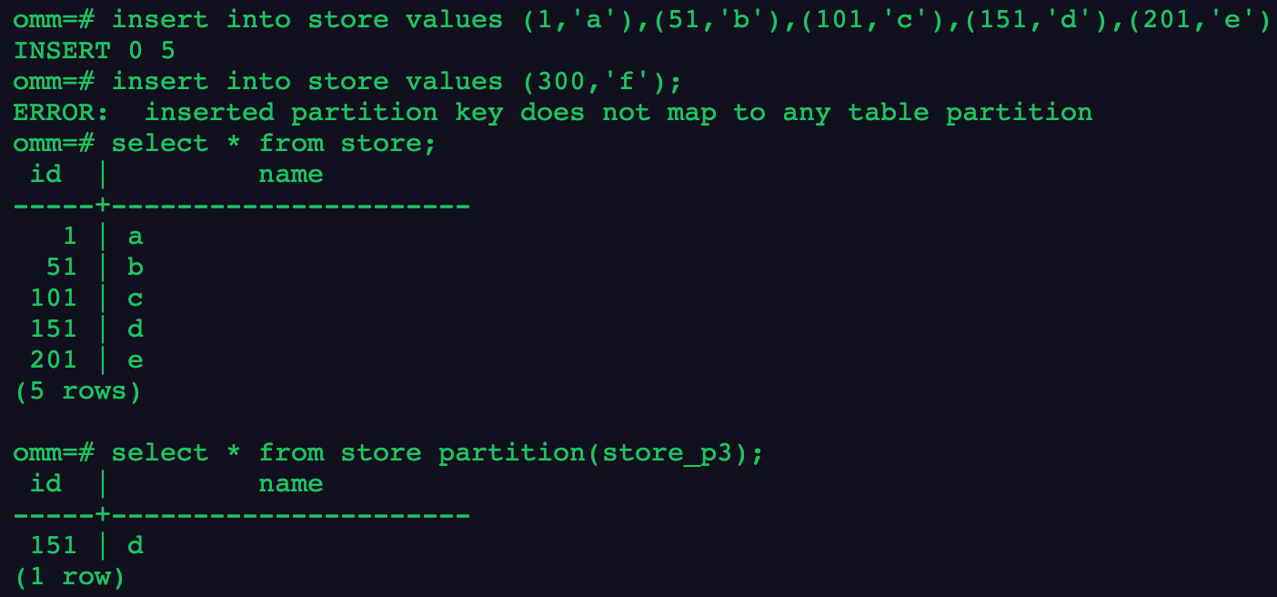 1.创建一个含有5个分区的范围分区表store,在每个分区中插入记录