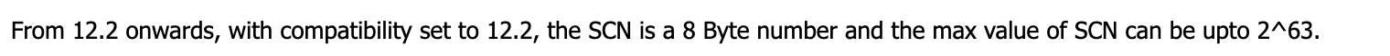 从 Oracle 12.2 版本开始 SCN 扩展至 8 字节,理论最大值为 2^63,约等于 922.33京 这提供了近乎无限的 SCN 增长空间。
