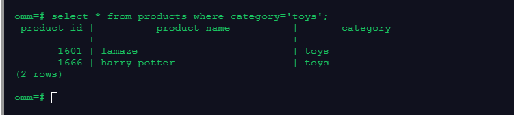 SQL: select * from products where category='toys';