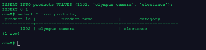INSERT INTO products VALUES (1502, 'olympus camera', 'electrncs');