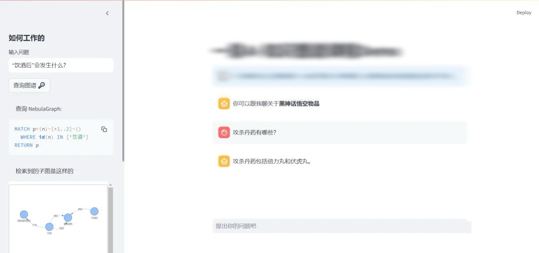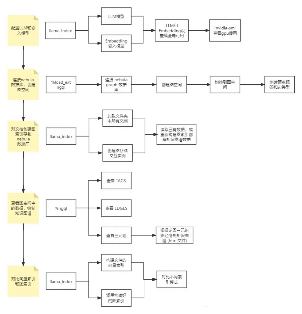 配置本地大语言(LLM)模型和中文文本嵌入(Embedding)模型。 连接本地图数据库 NebulaGraph 并创建"wukong"图空间。 使用 LlamaIndex 加载本地文件夹中的文档,构建图索引并保存到 NebulaGraph 数据库的图空间。 查看保存到 NebulaGraph 的"wukong"的数据,并绘制知识图谱可视化的 html 格式文件。 对比常规向量语义查询的结果和知识图谱的查询结果。