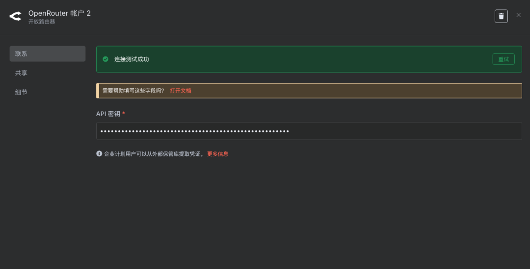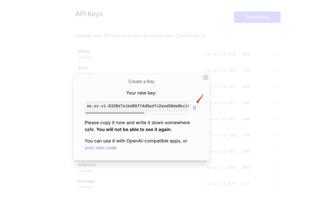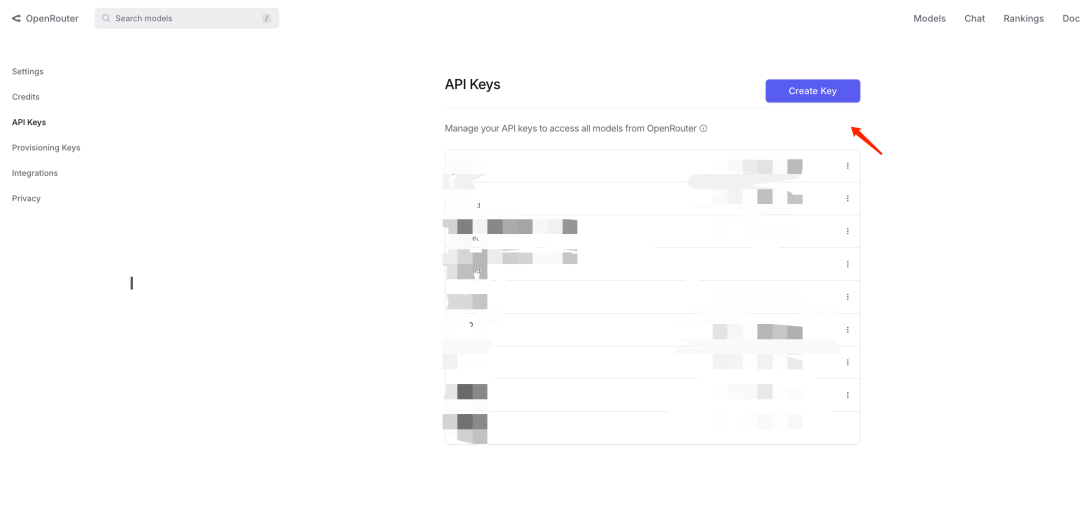 说明:在OpenRouter中为选定的模型创建一个API密钥(API-KEY),此密钥将用于后续的API调用。