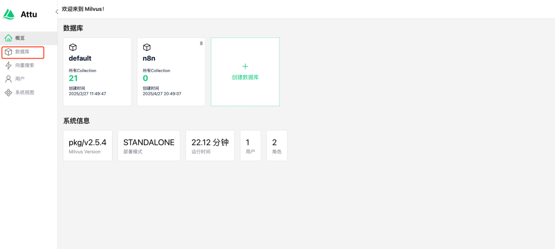docker run -d -p 8000:3000 -e MILVUS_URL=192.168.7.147:19530 registry.cn-hangzhou.aliyuncs.com/xy-zy/attu:v2.5Attu面板将运行在 服务器IP:8000 。