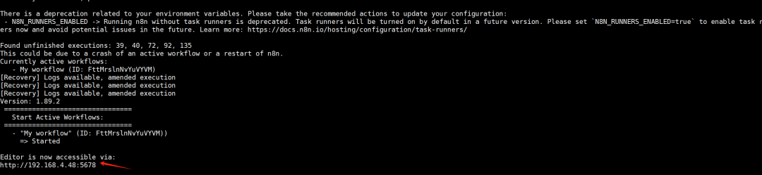 docker run -d -it --rm --name n8n -p 5678:5678 -v n8n_data:/home/node/.n8n -e N8N_SECURE_COOKIE=false -e N8N_HOST=192.168.4.48 -e N8N_LISTEN_ADDRESS=0.0.0.0 registry.cn-hangzhou.aliyuncs.com/n8n:latest安装完成后,您可以通过浏览器访问 IP地址:5678来打开N8N主页。