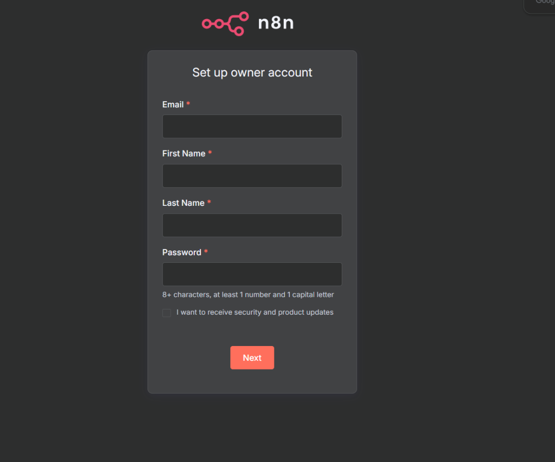 说明首次访问N8N时,请根据提示完成账户信息的初始化设置。