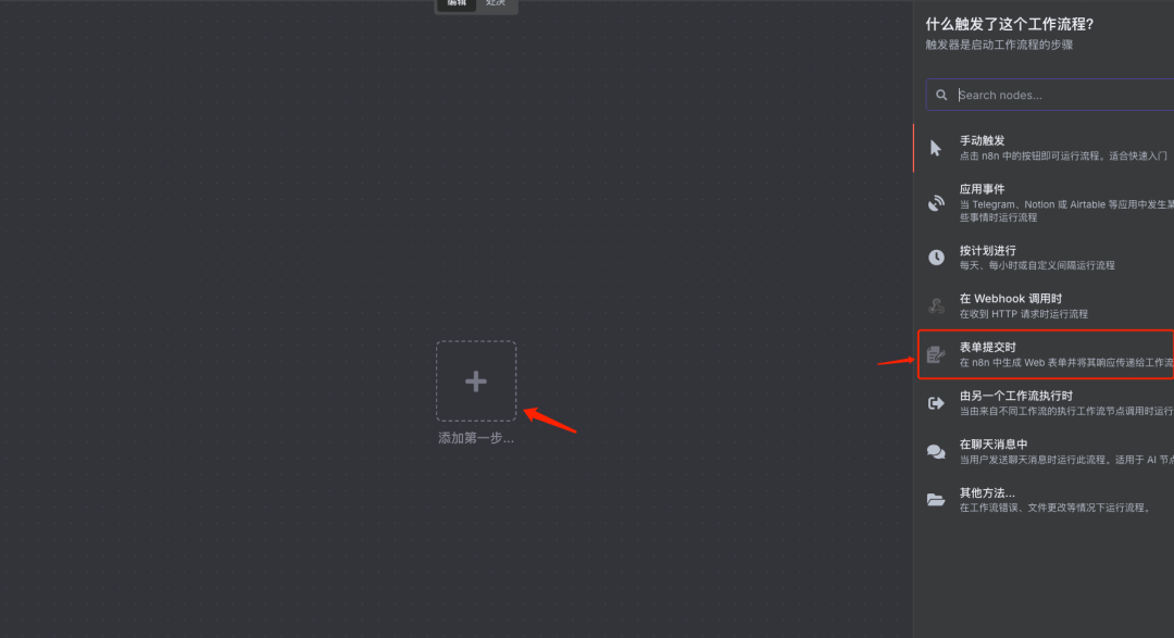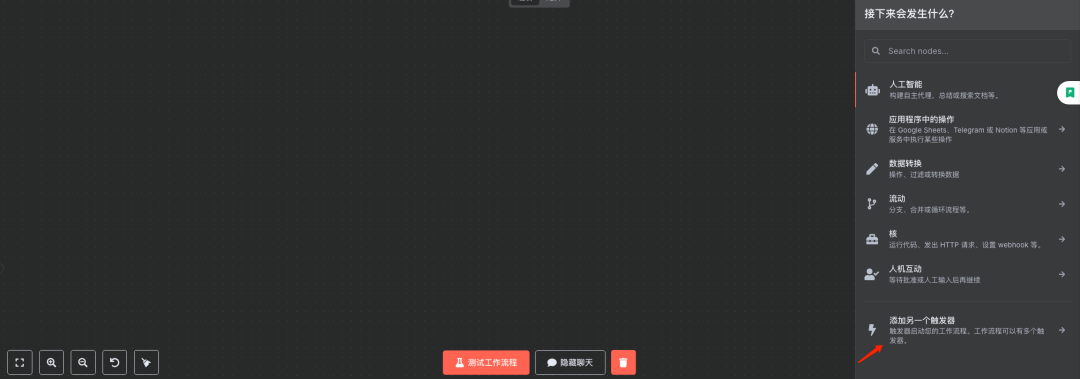 说明:在工作流编辑界面,点击“+”号,选择“Manual” (手动触发)作为工作流的起始节点。