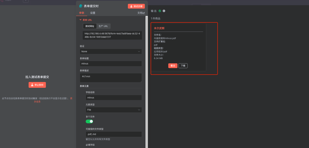 说明:从触发节点上传一个任意PDF格式的文本即可自动完成向量存储过程。 运行整个第一阶段工作流,上传一个PDF文件进行测试。