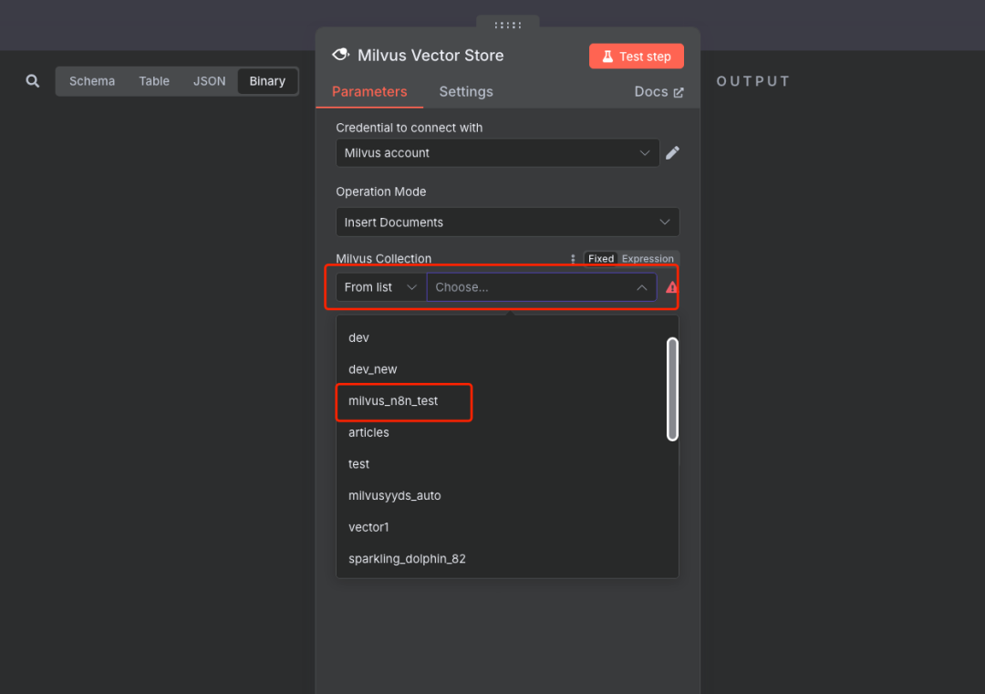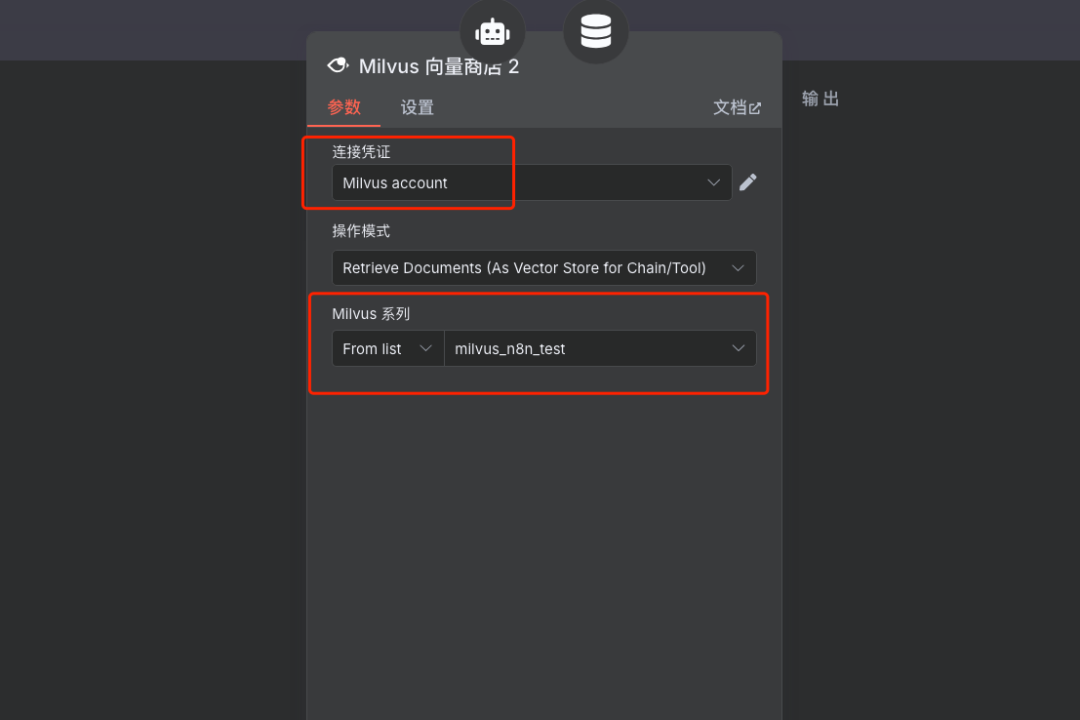 说明:在Milvus节点配置中,创建或选择已有的Milvus连接凭证,填入Milvus服务地址并选择创建好的Collection