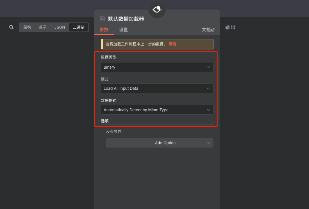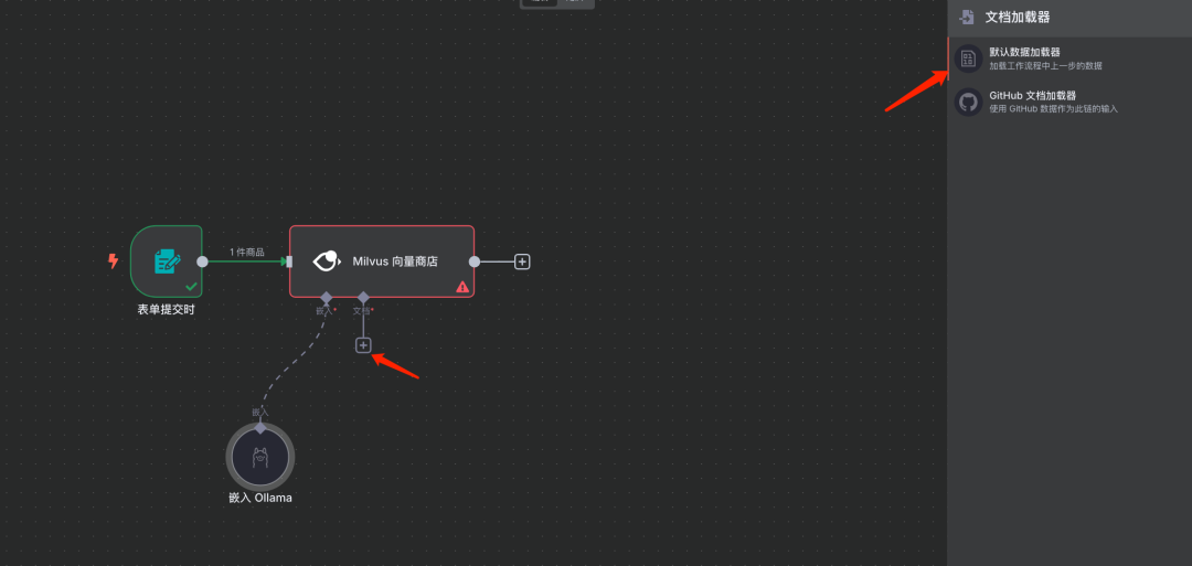 数据格式:自动选择 (Auto-select) 添加一个文档加载器节点,用于处理上传的文件数据。