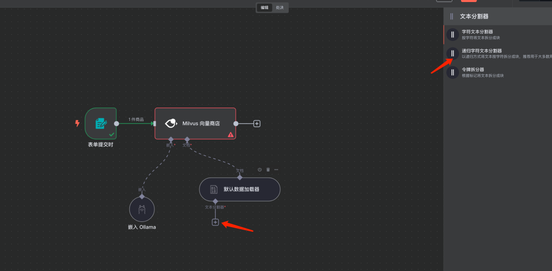 说明:选择适用于大部分场景的递归方式 (Recursive Character Text Splitter)。 在文档加载器之后添加文本分割器节点,将文档内容分割成小块以便进行向量化。