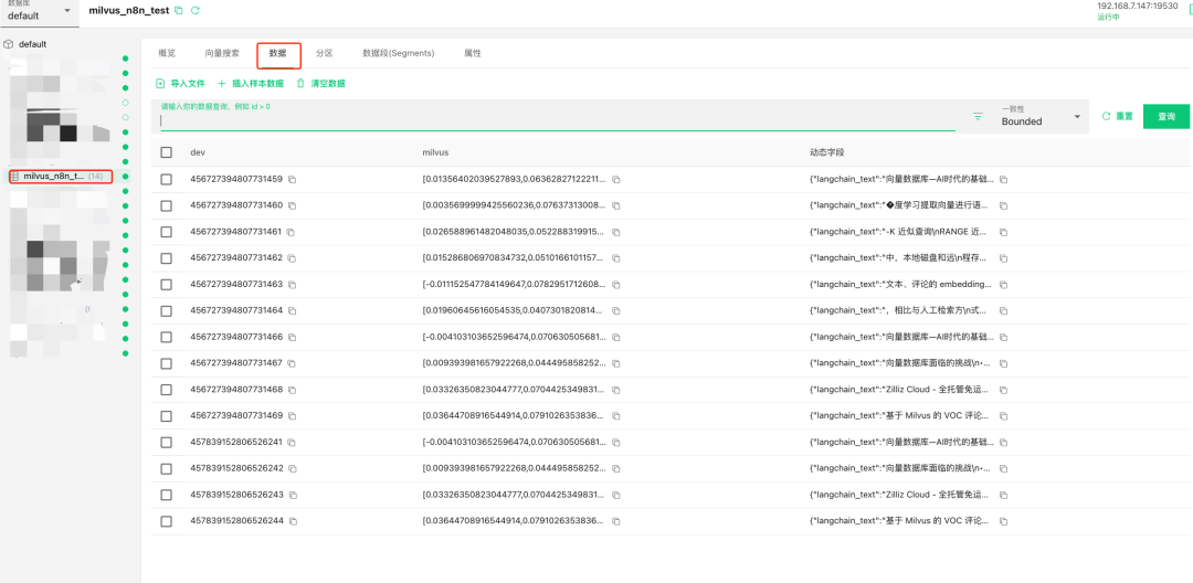 说明:测试完成后,检查Milvus数据库对应的Collection,确认文本向量是否已成功嵌入。