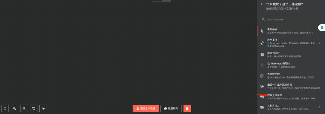 说明:在N8N中创建一个新的工作流或在现有工作流中添加一个聊天触发器(例如 "Webhook" 节点或专门的聊天机器人触发器),用于接收用户输入的问题。