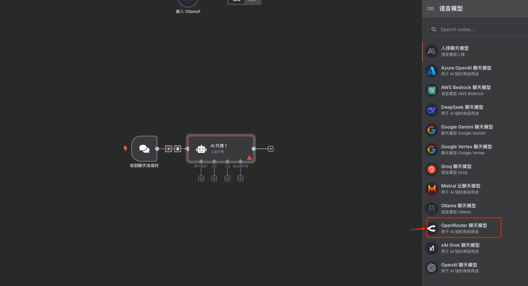 说明:添加一个AI Agent或类似的逻辑处理节点,用于协调后续的LLM调用和工具使用。
