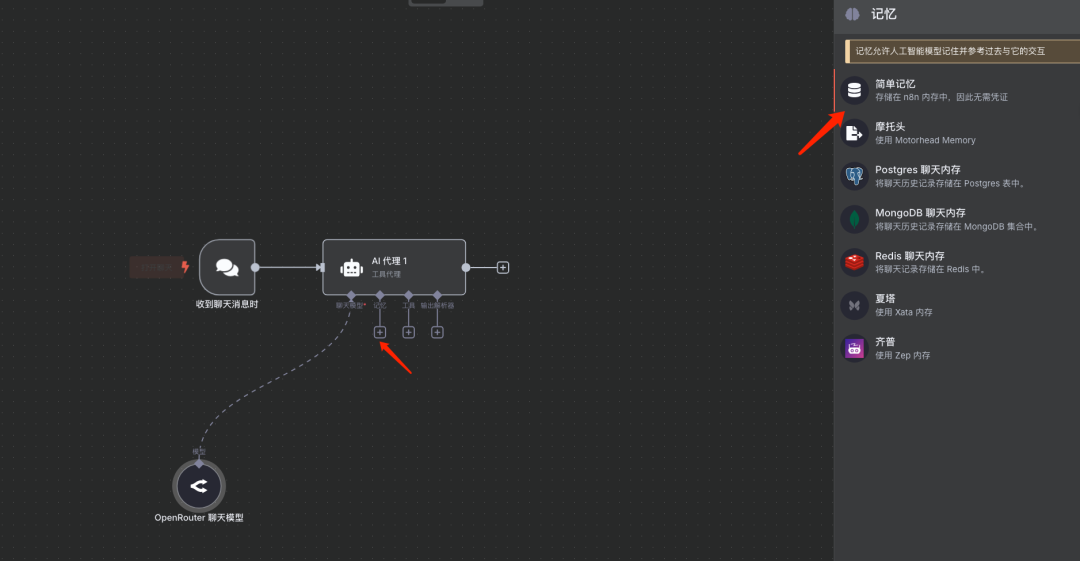 说明:本文采用简单记忆作为演示。 为聊天流程配置记忆功能(例如 "Simple Memory"),使得对话能够保持上下文。
